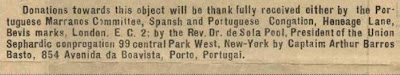 A pedido do Sr. Israel Levy, Rabbi mór de França (um dos membros do Comitê dos Marranos Portugueses), o falecido Barão Edmund Rothchild dera 500 Libras para o fundo de construção, mas o seu não foi seguido por ninguém.